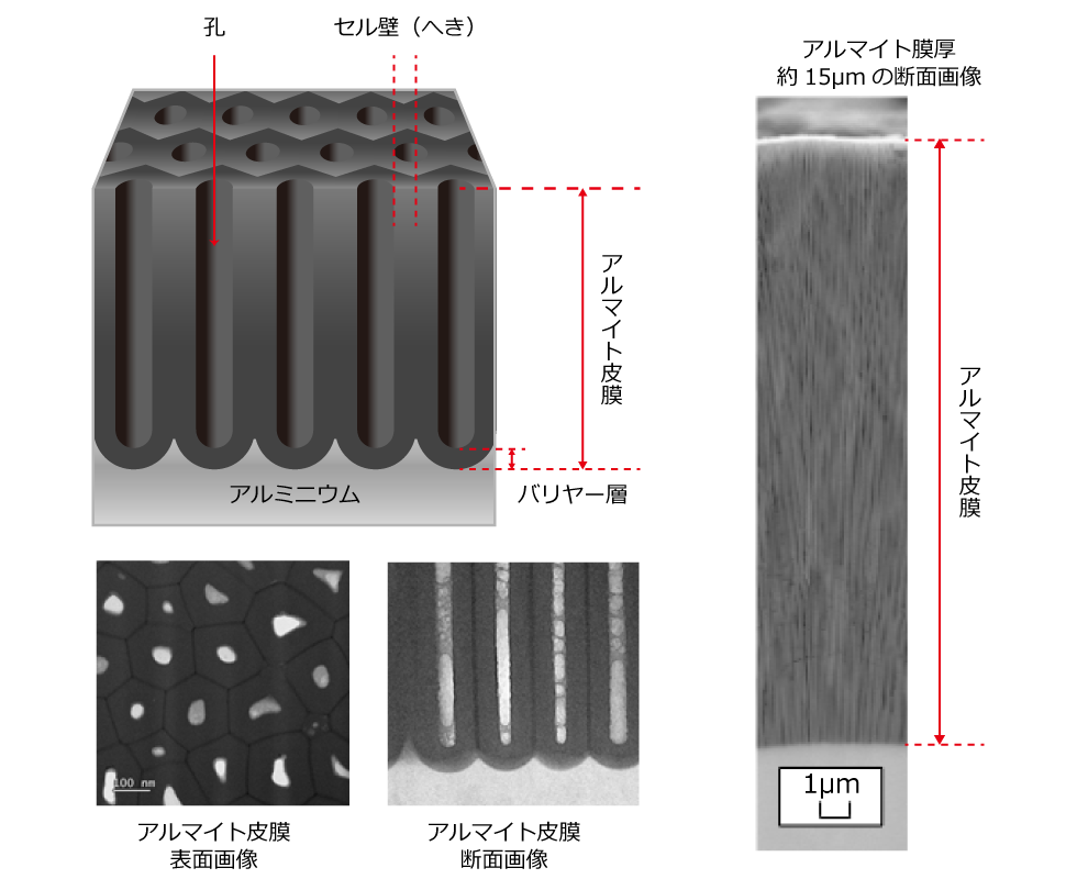 また、シュウ酸アルマイトは「セル壁が厚い」「孔径が小さい」ことから、硫酸アルマイトに比べて皮膜が緻密なので熱膨張への耐性が高く、クラックが発生しにくい特徴があります。