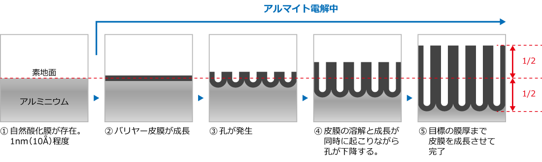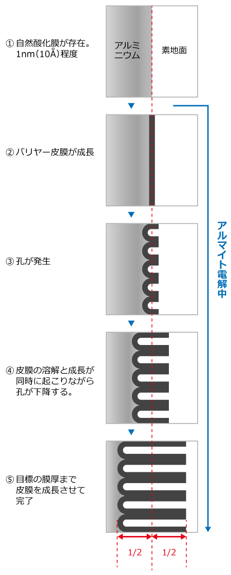アルマイト処理前の素地面を基準として、アルマイト皮膜の膜厚のうち1/2は素地面より外へ成長し、1/2は内へ成長します。