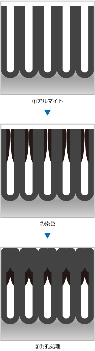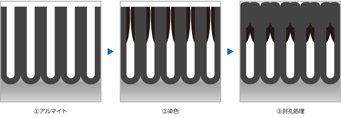アルマイト皮膜には無数の微細な孔が存在し、「封孔処理」により孔を閉じることで、耐食性が向上します。